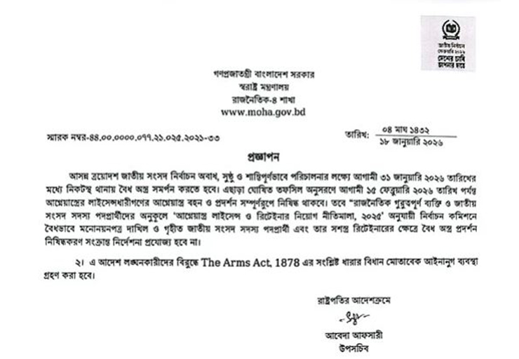 প্রজ্ঞাপনে বলা হয়েছে, ঘোষিত তফসিল অনুযায়ী আগামী ১৫ ফেব্রুয়ারি পর্যন্ত আগ্নেয়াস্ত্র বহন ও প্রদর্শন সম্পূর্ণ নিষিদ্ধ থাকবে। এ সময়ের মধ্যে কোনো লাইসেন্সধারী ব্যক্তি আগ্নেয়াস্ত্র সঙ্গে রাখা বা প্রকাশ্যে প্রদর্শন করতে পারবেন না।
