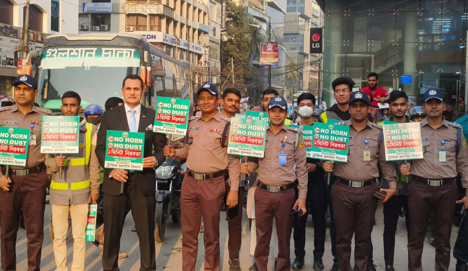গুলশানে ট্রাফিক পুলিশের ‘নো হর্ন, নো ডাস্ট কর্মসূচি’, শব্দ দূষণ রোধে চালকদের স্বতঃস্ফূর্ত অংশগ্রহণ