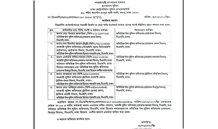 বদলি কর্মকর্তাদের মধ্যে— রমনা গোয়েন্দা বিভাগের এডিসি মো. ইমরান জাকারিয়াকে প্রটেকশন বিভাগে, ডিআইপি অ্যান্ড ভিভিআইপি প্রটেকশন বিভাগের মো. জিয়াউর রহমান চৌধুরীকে গোয়েন্দা রমনা বিভাগে, মিরপুর গোয়েন্দা বিভাগের এনায়েত কবীর সোয়েবকে লালবাগ (গোয়েন্দা) বিভাগের এডিসি, ধানমন্ডি ট্রাফিক বিভাগের ফারজানা হককে ট্রাফিক মতিঝিল এবং ট্রাফিক ডেমরা জোনের মো. সাজিদুর রহমানকে গোয়েন্দা মিরপুর বিভাগের এডিসি করা হয়েছে।