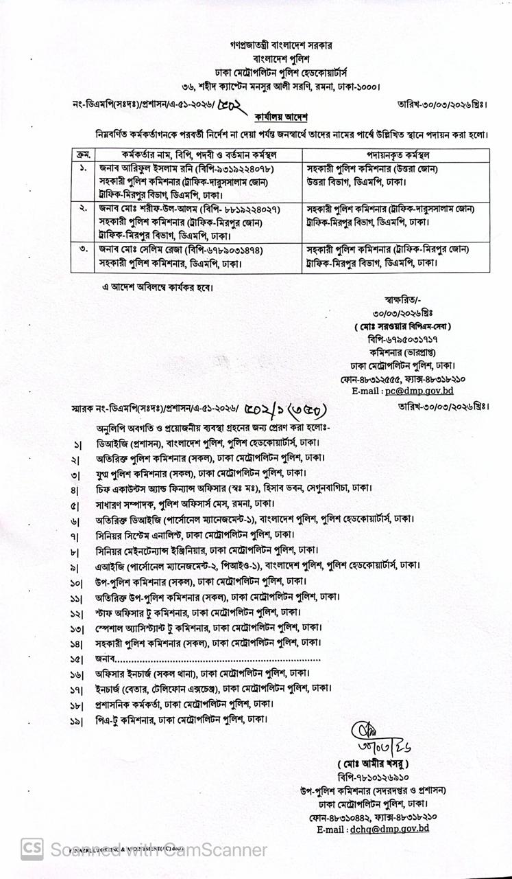 সোমবার(৩০ মার্চ) ডিএমপির ভারপ্রাপ্ত কমিশনার মো. সরওয়ার স্বাক্ষরিত এক অফিস আদেশে এ তথ্য জানা যায়।