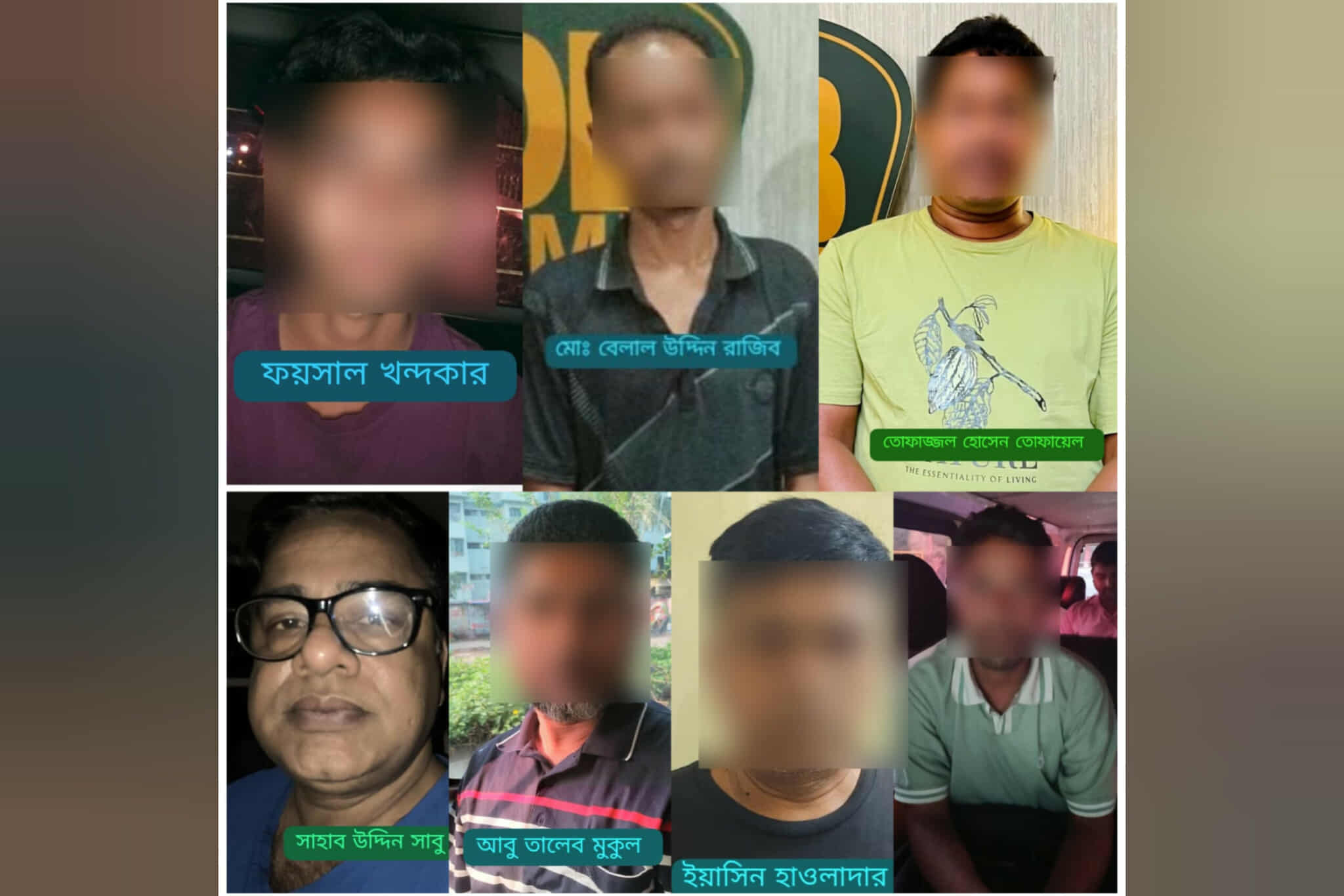 গ্রেফতাররা হলো, মো. রজব আলী (২০), মো. রুবেল ওরফে হাবু (২৪), মো. বশির হাওলাদার (২৬), মো. নাজমুল ইসলাম (২০), মো. ইয়ারুল (২৯), মো. গিয়াস শেখ (৩৫), মিতু আক্তার (৩০), মো. শিহাব (১৯) ও মো. অরুন (৫০)। এদের মধ্যে ১- ৬নং ডাকাতি প্রস্তুতি মামলায়,৭ মাদক মামলা, ৮- ৯ ডিএমপি ভুক্ত। এসময় তাদের কাছ থেকে ২ টি সামুরাই,