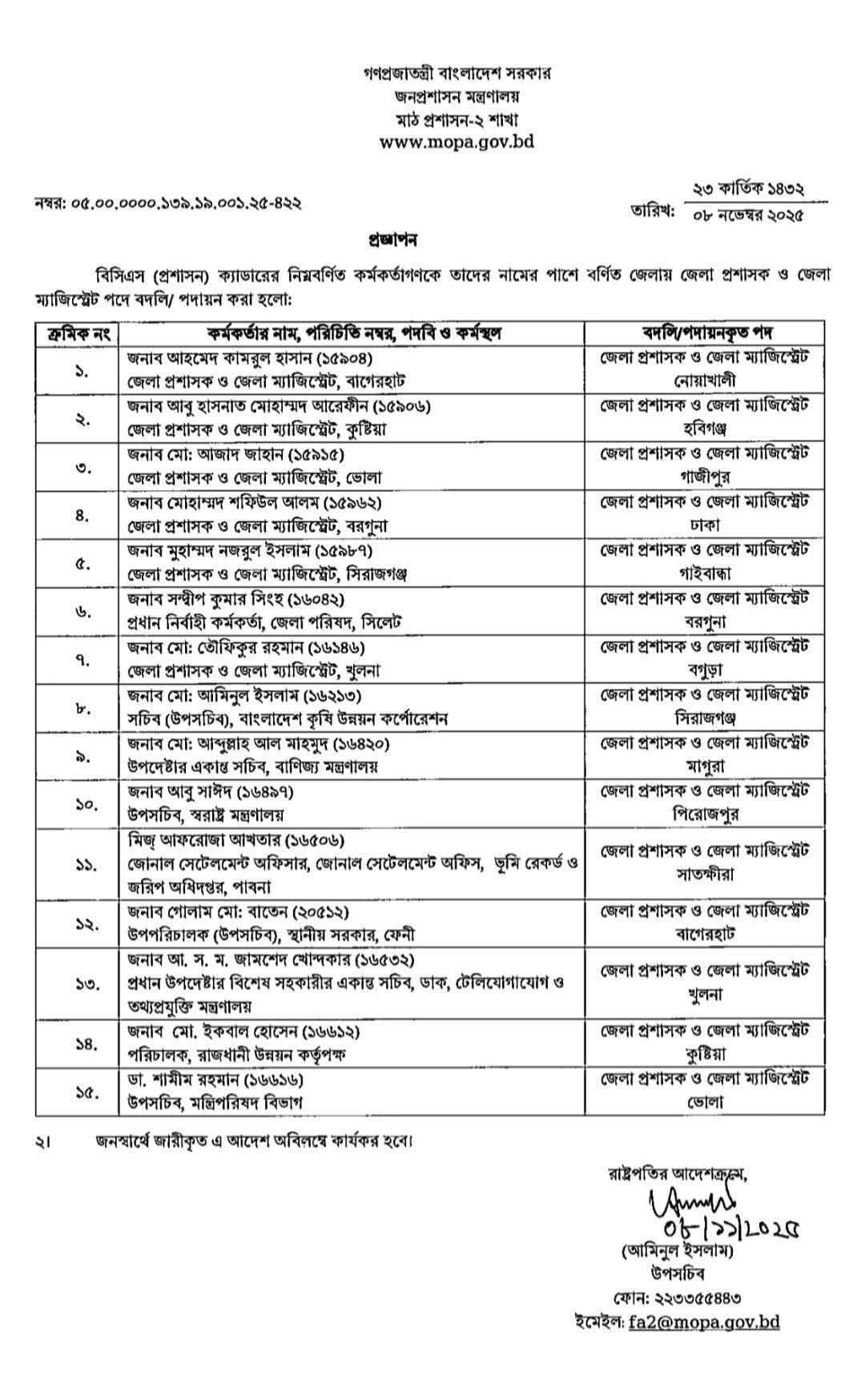 ভূমি রেকর্ড ও জরিপ অধিদপ্তর পাবনার জোনাল সেটেলমেন্ট অফিসার আফরোজা আখতারকে সাতক্ষীরা,ফেনীর স্থানীয় সরকারের উপপরিচালক (উপসচিব) গোলাম মো.বাতেনকে বাগেরহাট,ডাক, লটেলিযোগাযোগ ও তথ্যপ্রযুক্তি মন্ত্রণালয়ের প্রধান উপদেষ্টার বিশেষ সহকারীর একান্ত সবচিব আ স ম জামশেদ খোন্দকারকে খুলনা, রাজধানী উন্নয়ন কর্তৃপক্ষের (রাজউক) পরিচালক মো.ইকবাল হোসেনকে কুষ্টিয়া এবং মন্ত্রিপরিষদ বিভাগের উপসচিব শামীম রহমানকে ভোলার ডিসি নিয়োগ করেছে সরকার।