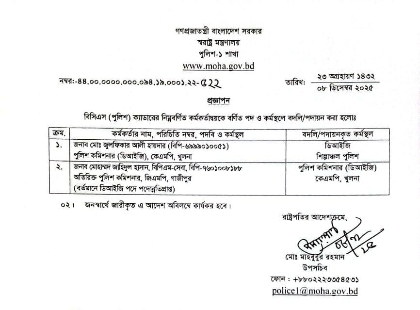সোমবার (৮ ডিসেম্বর) স্বরাষ্ট্র মন্ত্রণালয়ের পৃথক দুই প্রজ্ঞাপনে এ তথ্য জানা যায়।