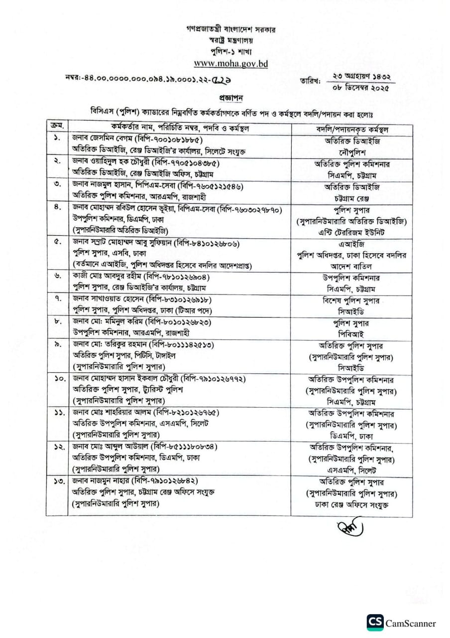 বদলিকৃত আরও ২০ কর্মকর্তার তালিকা দেখুন: