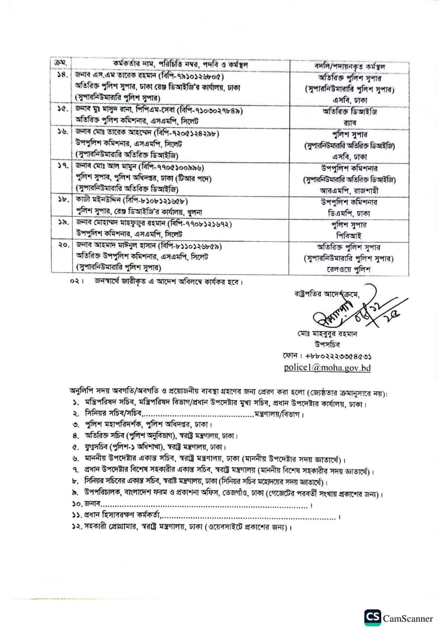 বদলিকৃতদের মধ্যে দুইজন ডিআইজি পদমর্যাদার কর্মকর্তা রয়েছেন। তাদেরমধ্যে খুলনা মেট্রোপলিটন পুলিশের (কেএমপি) কমিশনার মো.জুলফিকার আলী হায়দারকে শিল্পাঞ্চল পুলিশের ডিআইজি হিসেবে বদলি করা হয়েছে এবং গাজীপুর মেট্রোপলিটন পুলিশে (জিএমপি) কর্মরত মোহাম্মদ জাহিদুল হাসানকে বদলি করে কেএমপির কমিশনারের দায়িত্ব দেওয়া হয়েছে।