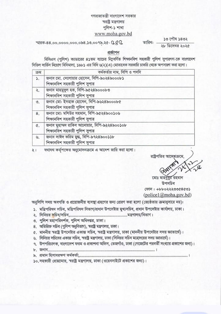 রবিবার(২৮ ডিসেম্বর) স্বরাষ্ট্র মন্ত্রণালয়ের পুলিশ শাখা-১ থেকে জারি করা এক প্রজ্ঞাপনে এ তথ্য জানানো হয়েছে।