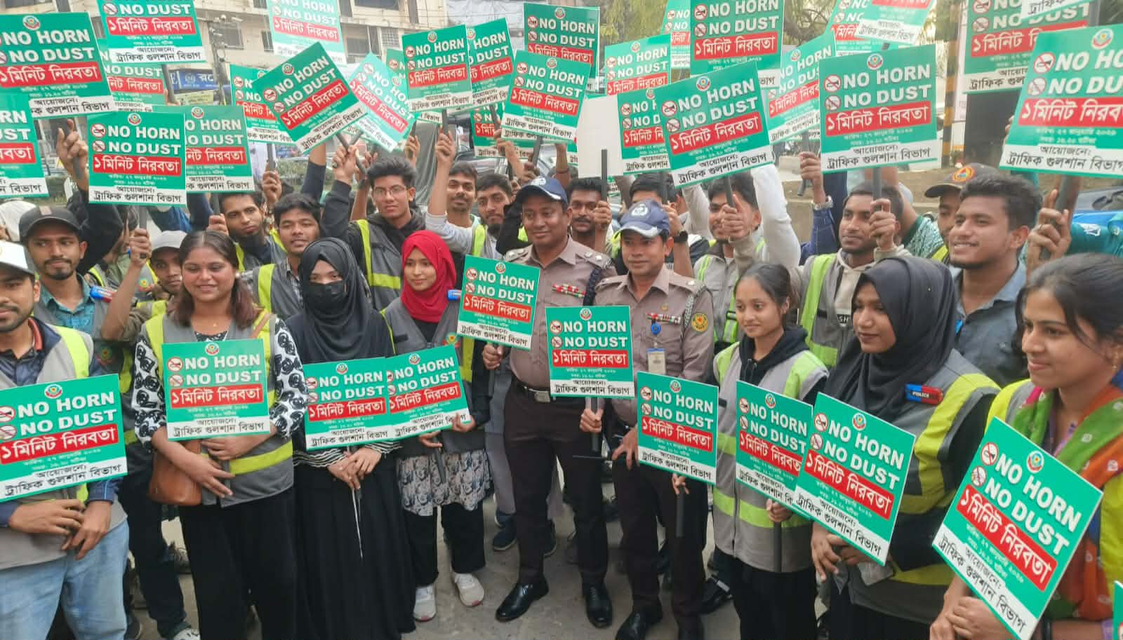 গুলশানে ট্রাফিক পুলিশের ‘নো হর্ন, নো ডাস্ট কর্মসূচি’, শব্দ দূষণ রোধে চালকদের স্বতঃস্ফূর্ত অংশগ্রহণ