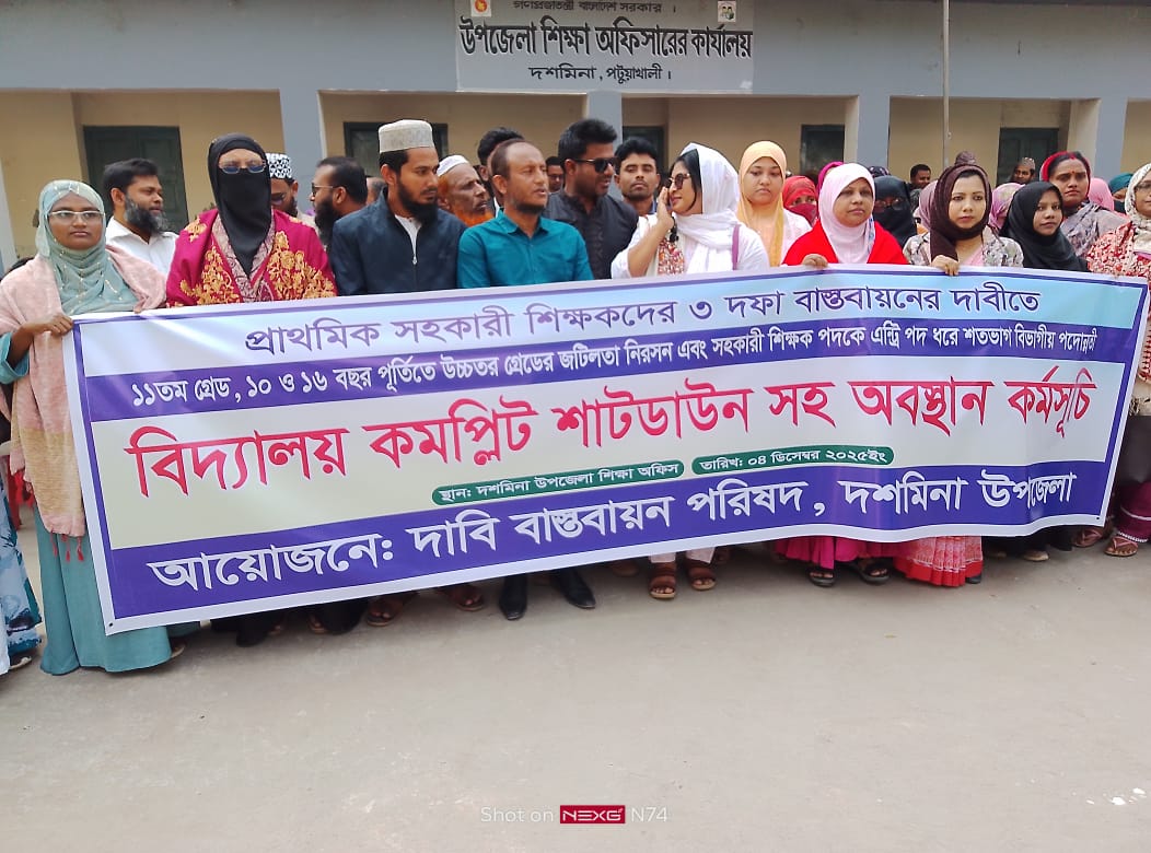 দশমিনা শিক্ষা অফিসের সামনে প্রাথমিক শিক্ষকদের তিন দফা দাবিতে কমপ্লিট শাটডাউন ও অবস্থান কর্মসূচি পালিত